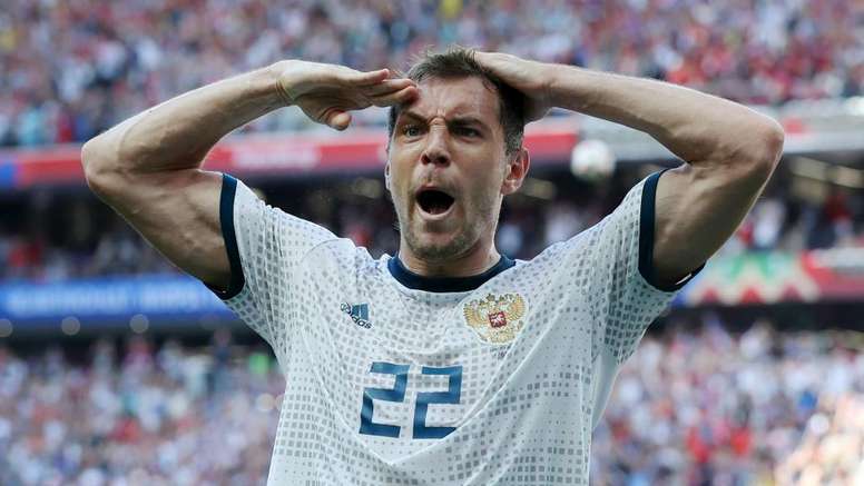 Na metade final do primeiro tempo, o time da casa começou a chegar com mais perigo. Golovin arriscou chute perigoso na entrada da área, e pouco depois Dzyuba converteu pênalti cometido por Gerard Piqué (que pôs a mão na bola) para deixar tudo igual.